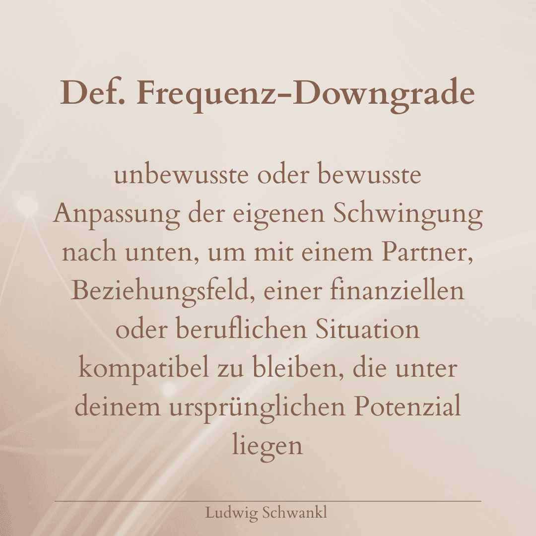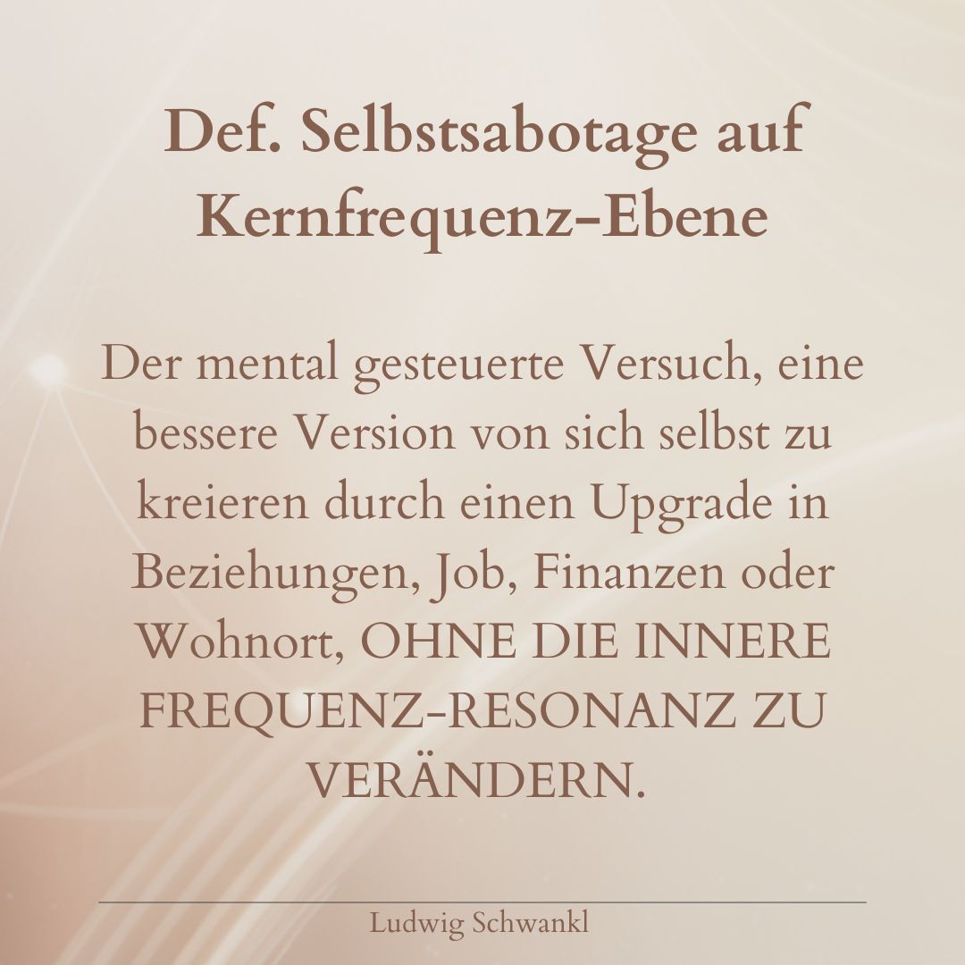 Ganz einfach. Wenn die Frequenz-Programmierung unseres Nervensystems, die im Übrigen durch bloße Regulation nicht weggemacht werden kann (der Frequenz-Code fühlt sich dann still gelegt an, steuert das System aber immer noch!), nur einen gewissen Frequenz-Standard kennt oder zulassen kann, wird diese sich als psychologischer Akt der Selbstsabotage manifestieren. Das Resultat: Eine Downgrade-Loop in Beziehungen, Erfolg, Gesundheit, Finanzen oder Berufung.
